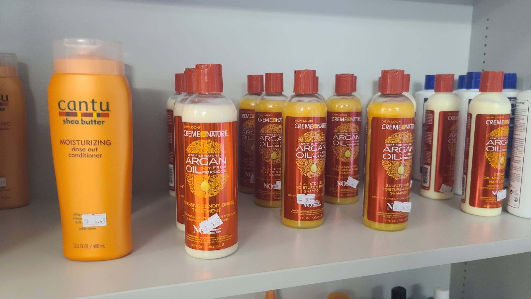 Currently lining her shelves are the traditional items you would find in a beauty supply store: wigs, weaves, hair conditioners, hair dye, brushes, and in her display case, beard kits for the fellas who wish to keep their facial hair soft and maintained.