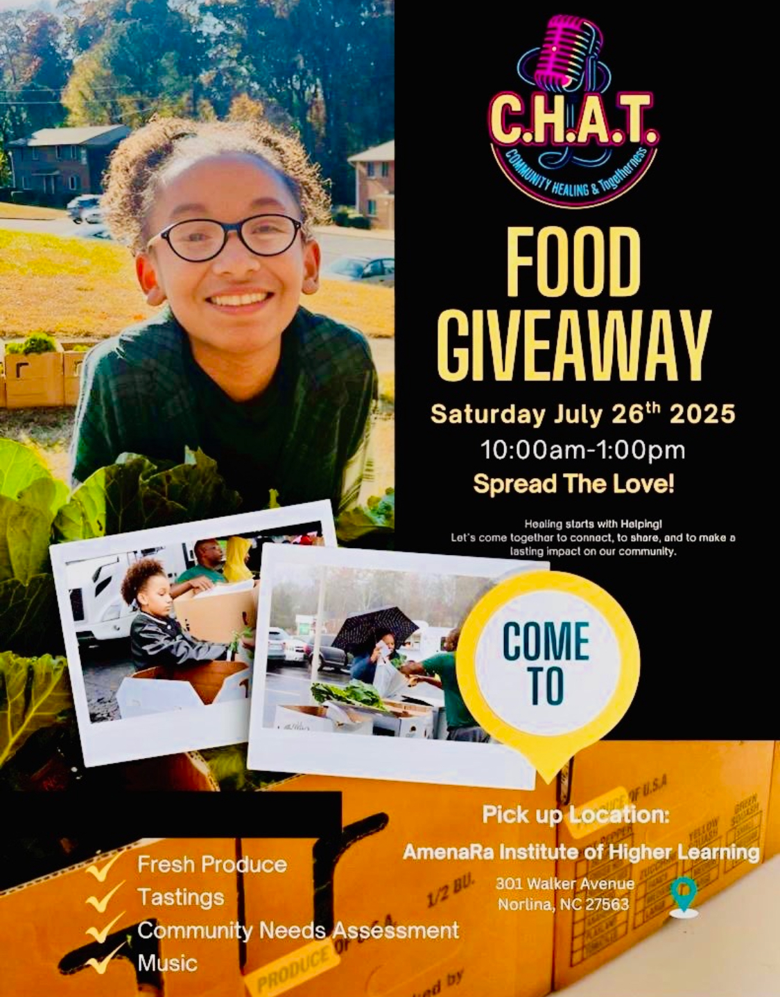 Come out to a free food giveaway on Saturday, July 26, from 10am-1pm at the AmenaRa Institute of Higher Learning in Norlina, NC.