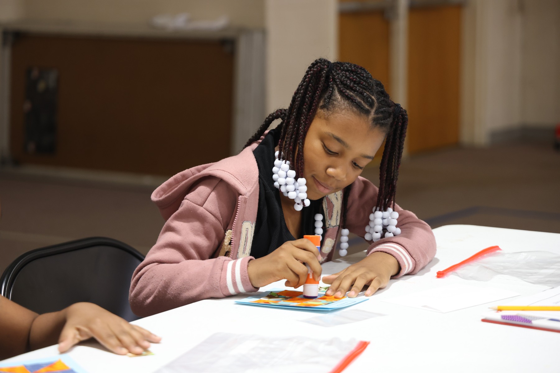 Cheston led the students in their activity: creating greeting cards using precut fabric to make a quilt block on the cover. With two blocks to choose from (the pinwheel and the nine-patch), the students grabbed their glue sticks, and quickly went to work. Afterwards, they were then encouraged to write a message inside to give to a loved one.