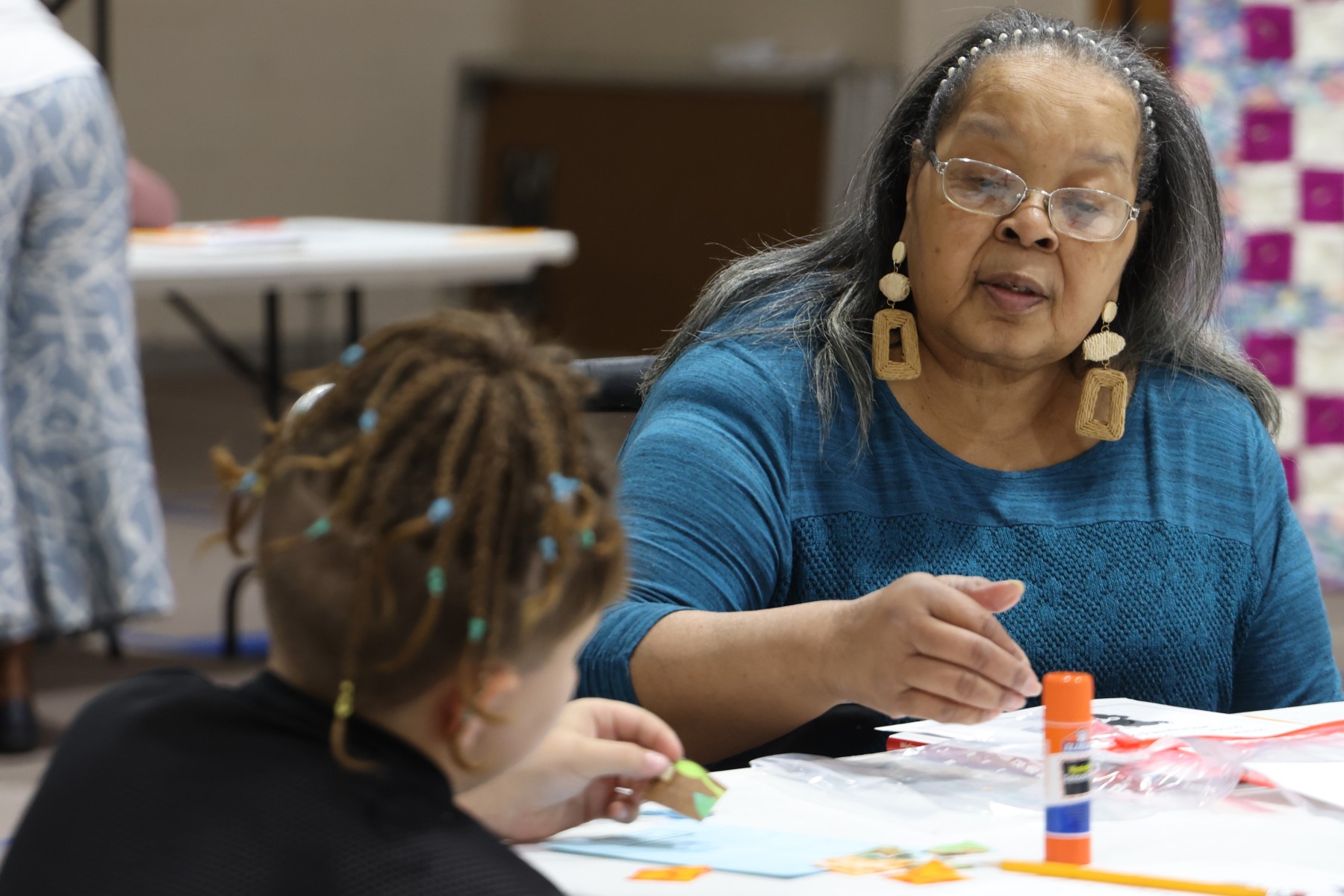 Cheston led the students in their activity: creating greeting cards using precut fabric to make a quilt block on the cover. With two blocks to choose from (the pinwheel and the nine-patch), the students grabbed their glue sticks, and quickly went to work. Afterwards, they were then encouraged to write a message inside to give to a loved one.