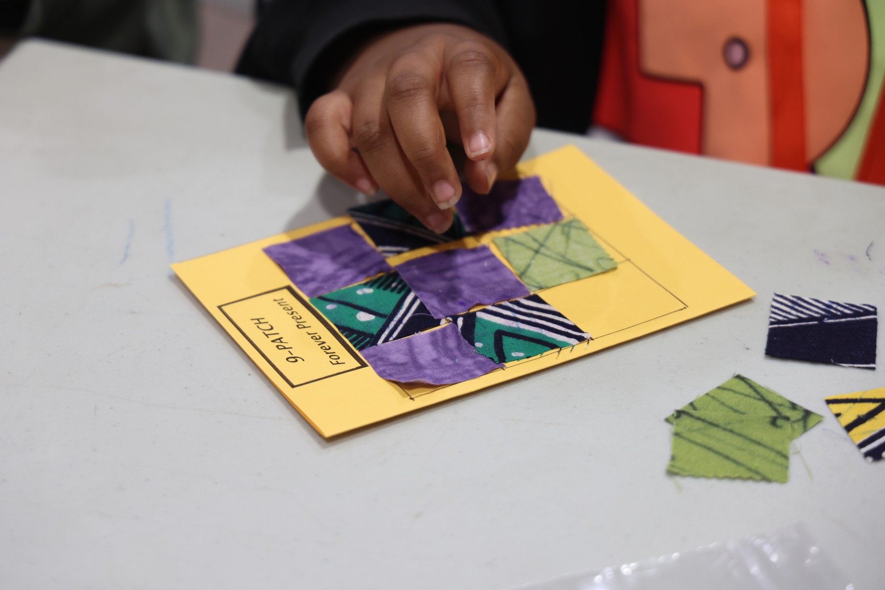 Cheston led the students in their activity: creating greeting cards using precut fabric to make a quilt block on the cover. With two blocks to choose from (the pinwheel and the nine-patch), the students grabbed their glue sticks, and quickly went to work. Afterwards, they were then encouraged to write a message inside to give to a loved one.